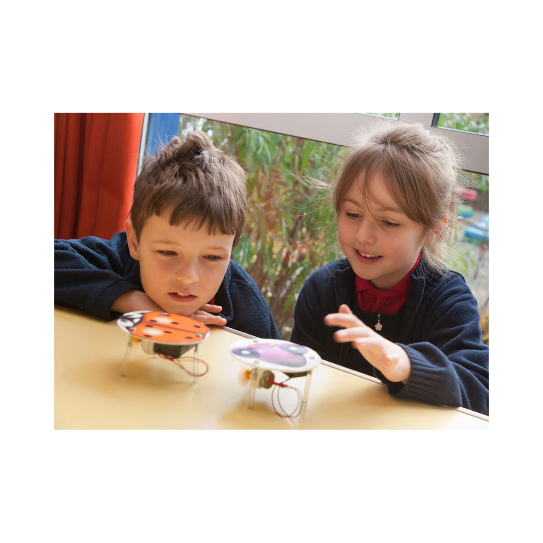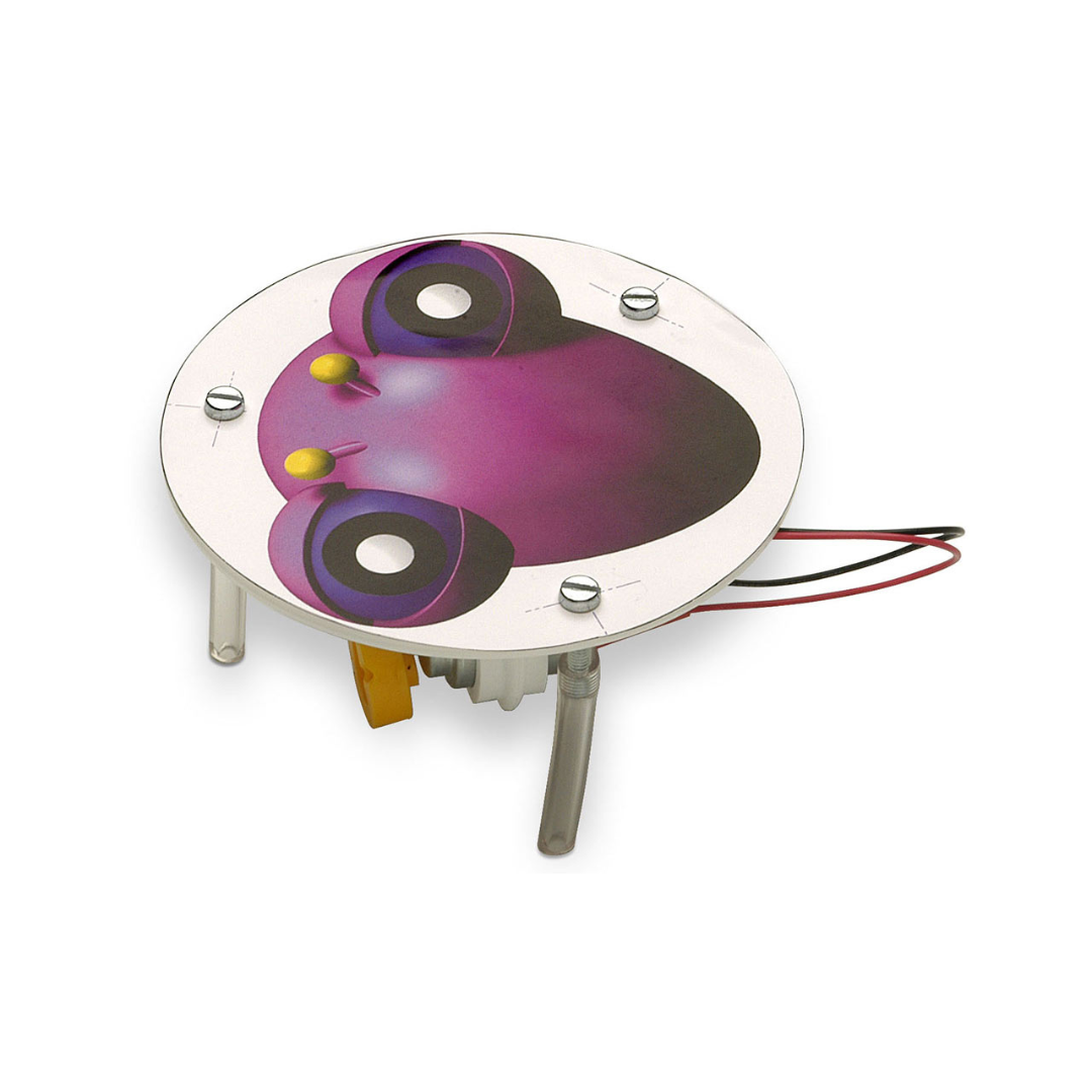 This kit makes use of a rapidly spinning off-centre mass to cause movement. When the battery is connected the bug vibrates and moves around at random on a hard surface. The battery and motor are hung underneath so that a graphic image can be glued on top of the plate.